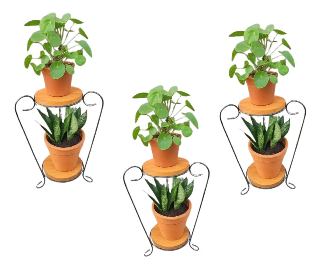 Suporte de ferro com três níveis para organizar vasos, otimizar espaços e valorizar plantas decorativas.