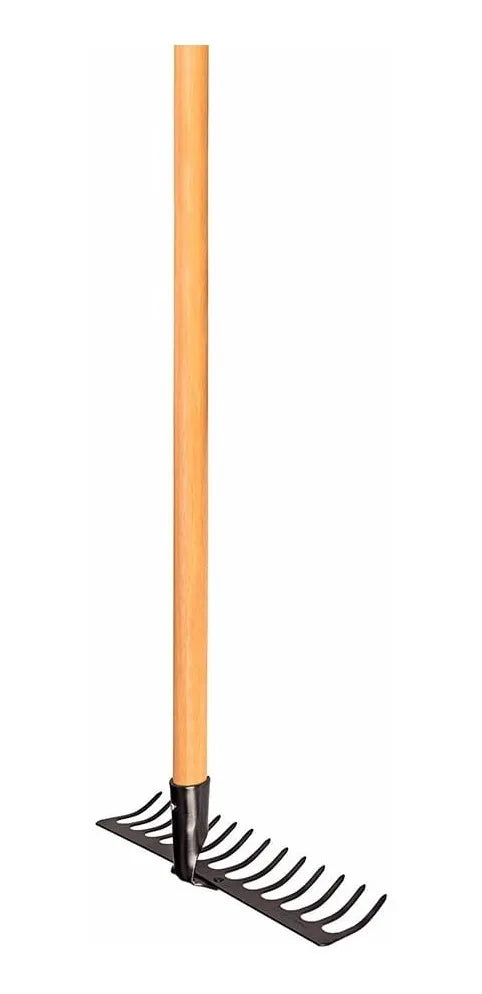 Rastelo metálico resistente para limpeza de folhas, nivelamento de solo e manutenção de jardins residenciais.